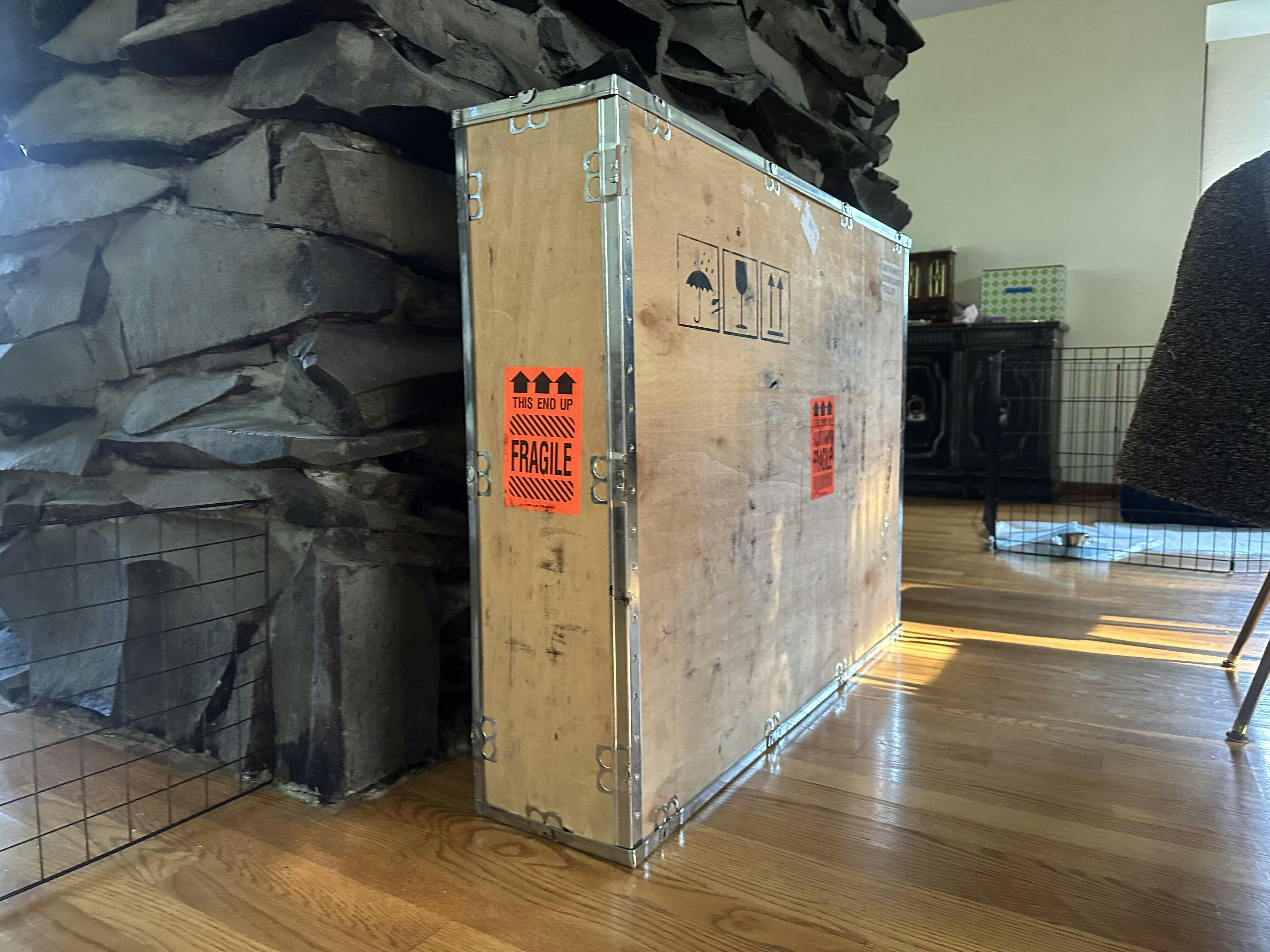 Angled view of the back of a medium grey K&J crate inside an industrial building, highlighting the side and rear airline rails for secure, IATA-compliant air travel.
